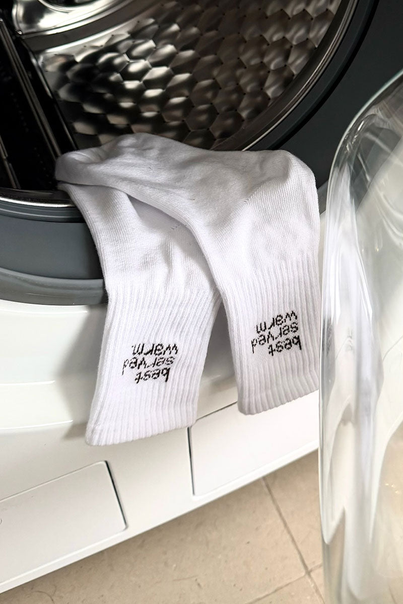 Our signature white cotton socks, with black writing Best Served Warm print on the side.